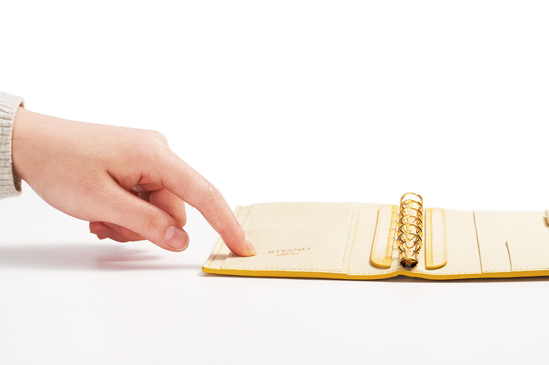 手帳にぴったりの小さく精巧な ファスナーポケット をデザインしました。リングバインダーの⽳に対応し、⾃由に取り付けることができます。また、下敷きとしても使え実⽤性を兼ね備えています。