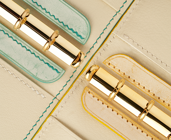 RITSNO では、製品を⻑くお使いいただけるよう、世界中の 一流ブランド の⾦属部品を使⽤して製造しています。PRYM あるいは THK のホック挽物*、YKK のファスナー、 Krause のバインダーなど。最高水準の 耐久性堅牢性 です。