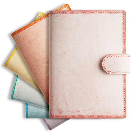 素材には、使うほどに変化する表情が魅力のイタリア製レザー「ゴースト」を採用。タンニンなめし革ならではの深いエイジングに加え、表面を覆うワックスが少しずつ薄れていくことで、まるで新雪が溶けていくように、革本来の鮮やかな色が少しずつ現れる特徴的な一冊です。